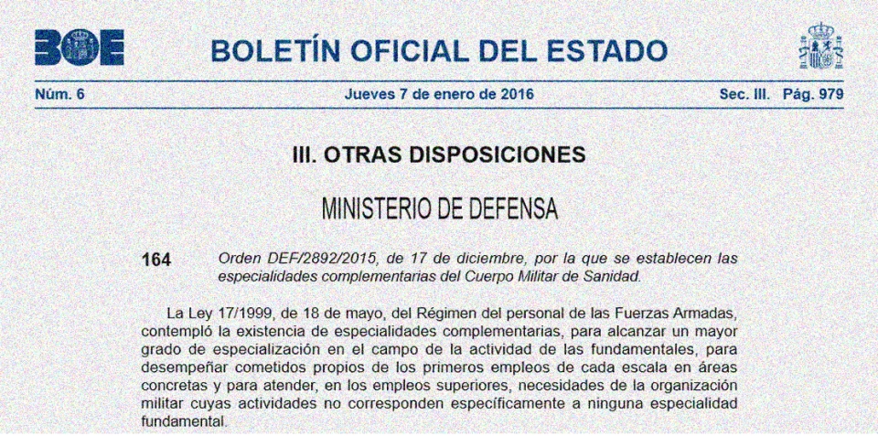 Madrid 7 de enero 2016: El Ministerio de Defensa ha publicado hoy en el BOE, la aprobación y procedimiento para la obtención de las especialidades y con ello alcanzar un mayor grado de especialización en el campo de la actividad, las cuales pueden obtenerse por dos vías: mediante la convalidación de titulaciones del sistema educativo general o por cursar enseñanzas impartidas en la estructura docente del Ministerio de Defensa.